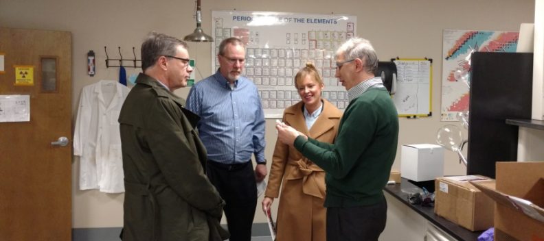 Colleen Kerr (WSU Vice President for Government Relations and External Affairs, Chief Legislative Officer), Christopher Keane (WSU Vice President for Research and Professor of Physics), and Dan Nordquist (Associate Vice President, Office of Research Support and Operations) visited the USTUR. USTUR director, Sergei Tolmachev, discussed the history and significance of the USTUR program, and provided a tour of the USTUR laboratory, which includes an autopsy room, a radiochemistry laboratory, an alpha spectrometry counting room, and a sample storage area.