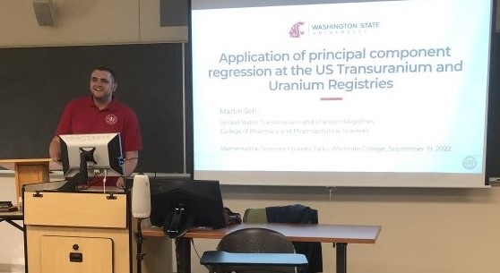 Martin Šefl gave a seminar presentation to undergraduate students from Whitman College in Walla Walla, Washington. His presentation, which is a part of the Mathematical Sciences Foundry Talks series, explained how a principal component regression was used to estimate the total amount of plutonium in the entire skeleton, based on the activity concentrations in a limited subset of bones. This approach is preferred to calculating an arithmetic mean, because it reduces the risk of bias for non-representative bone sampling, utilizes all available information, and reduces the uncertainty.