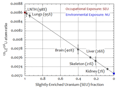 Tissues collected at autopsy were acid digested, and the resulting acid solutions were analyzed using inductively coupled mass spectrometry (ICP-MS). ICP-MS not only quantifies the amount of uranium present in a sample; it provides the 235U/238U and 234U/238U isotopic ratios. These ratios revealed that the Registrant was exposed to slightly-enriched uranium. This was surprising given that he was thought to have been exposed to natural uranium. The tissue analysis also found that enriched uranium remained in the Registrant’s lungs and lymph nodes (plot at right) at the time of death, and there was a higher concentration of uranium in his lymph nodes than in his lungs at the time of death. Both of these observations are inconsistent with the assumption that he inhaled pure ‘soluble’ (Type F) material, as is recommended for UF6.